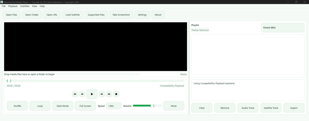 MaimboSoft Media Player is a modern Windows media player designed for smooth video and audio playback with an easy-to-use interface. It lets users open media files, folders, and stream URLs, manage playlists, switch audio and subtitle tracks, adjust subtitle size and timing, capture screenshots, control playback speed, and watch in fullscreen with flexible aspect ratio options. The application also includes resume playback, shuffle and loop controls, drag-and-drop support, and customizable themes with accent colors for a more personalized viewing experience.